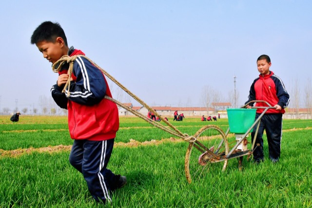 山东淄博高青县唐坊学区和店小学的孩子们正在农民伯伯的指导下,认真地辨识哪些是麦苗、哪些是杂草。(中国教育报-中国教育新闻网 通讯员 孙传波 摄)