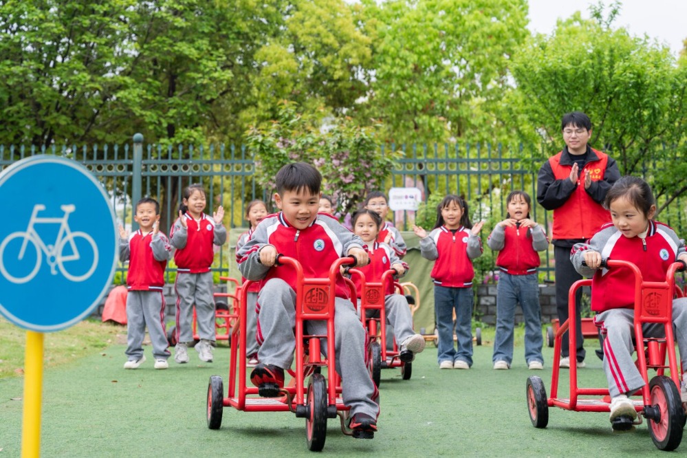 志愿者带领孩子体验交通安全出行。通讯员 王徐超 摄