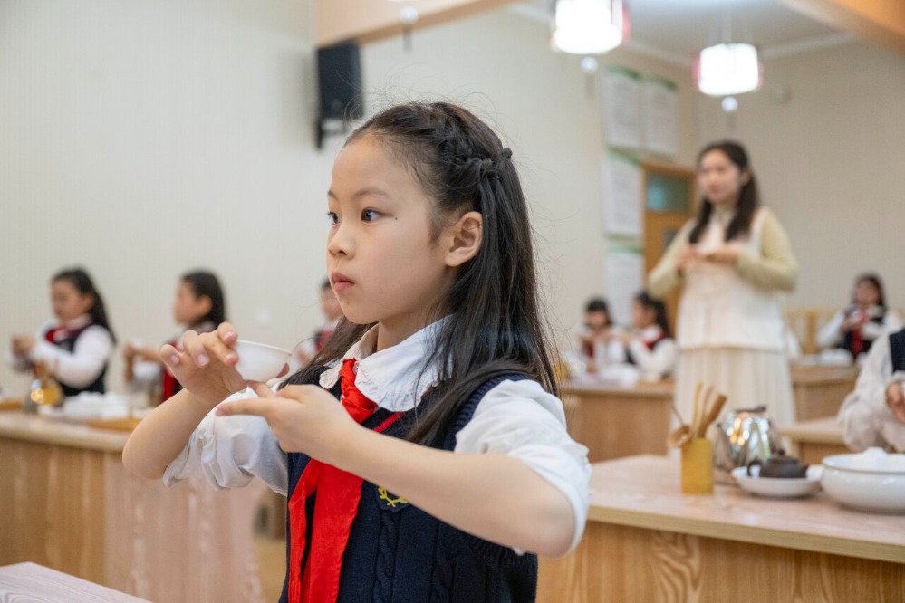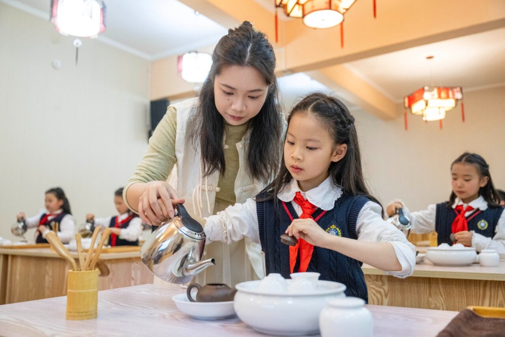 4月16日,在安徽农业大学茶业学院,来自合肥市亳州路小学的学生在茶艺老师的指导下学习茶艺,了解中国传统茶艺文化,感受茶艺之美,传承非遗之韵。中国教育报-中国教育新闻网通讯员 赵明 摄