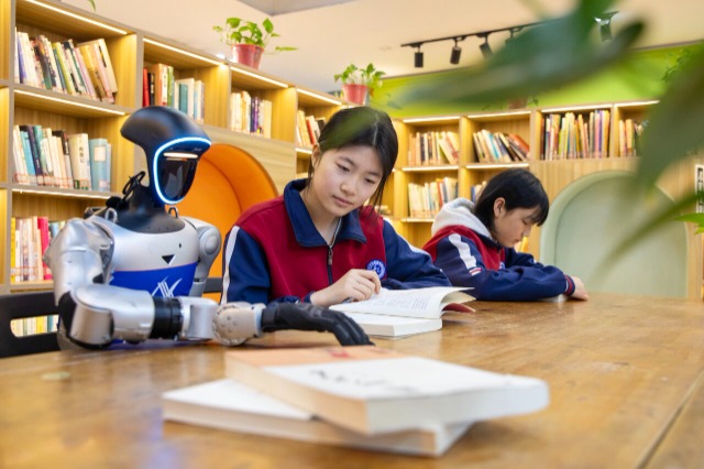 学生们与机器人一起阅读书籍 李旭晖 摄