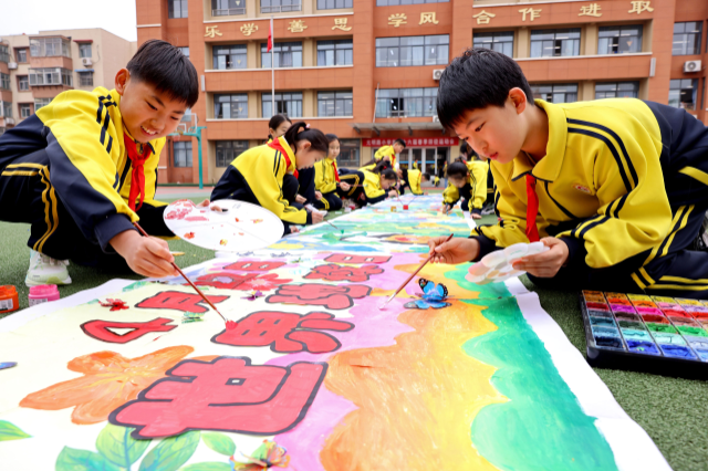 学生在描绘“珍爱地球 守护美丽家园”画卷 孙中喆 李響 摄