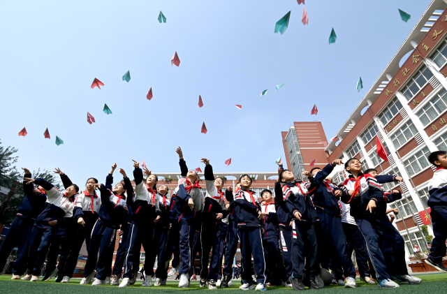 4月23日,河北省邯郸市邯山区实验小学开展“学习航天知识、激发科学热情”主题教育活动,学生们学习航天科技知识,探求宇宙奥秘,激发科学探索热情,迎接4月24日“中国航天日”。(中国教育报-中国教育新闻网 通讯员 郝群英 摄)