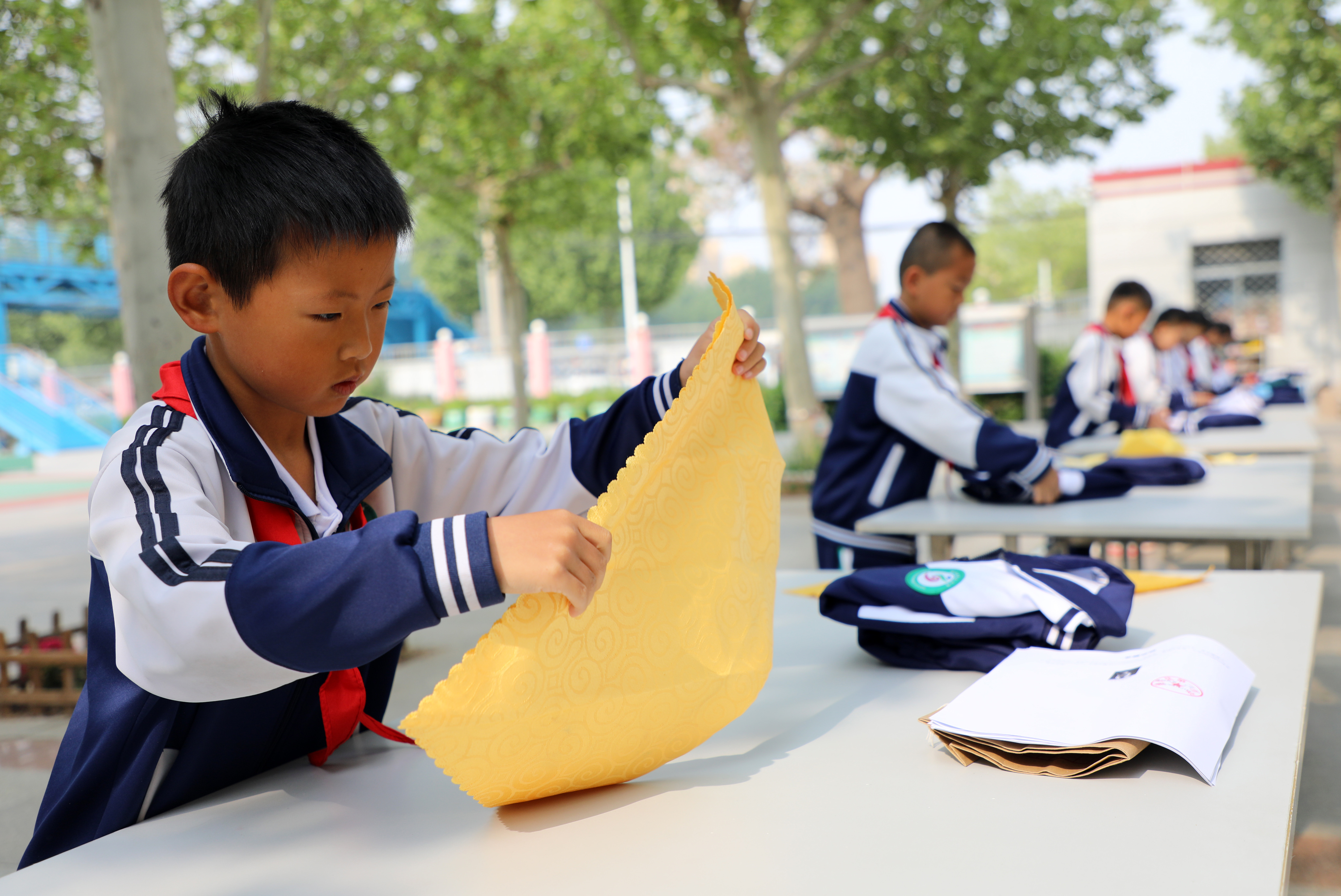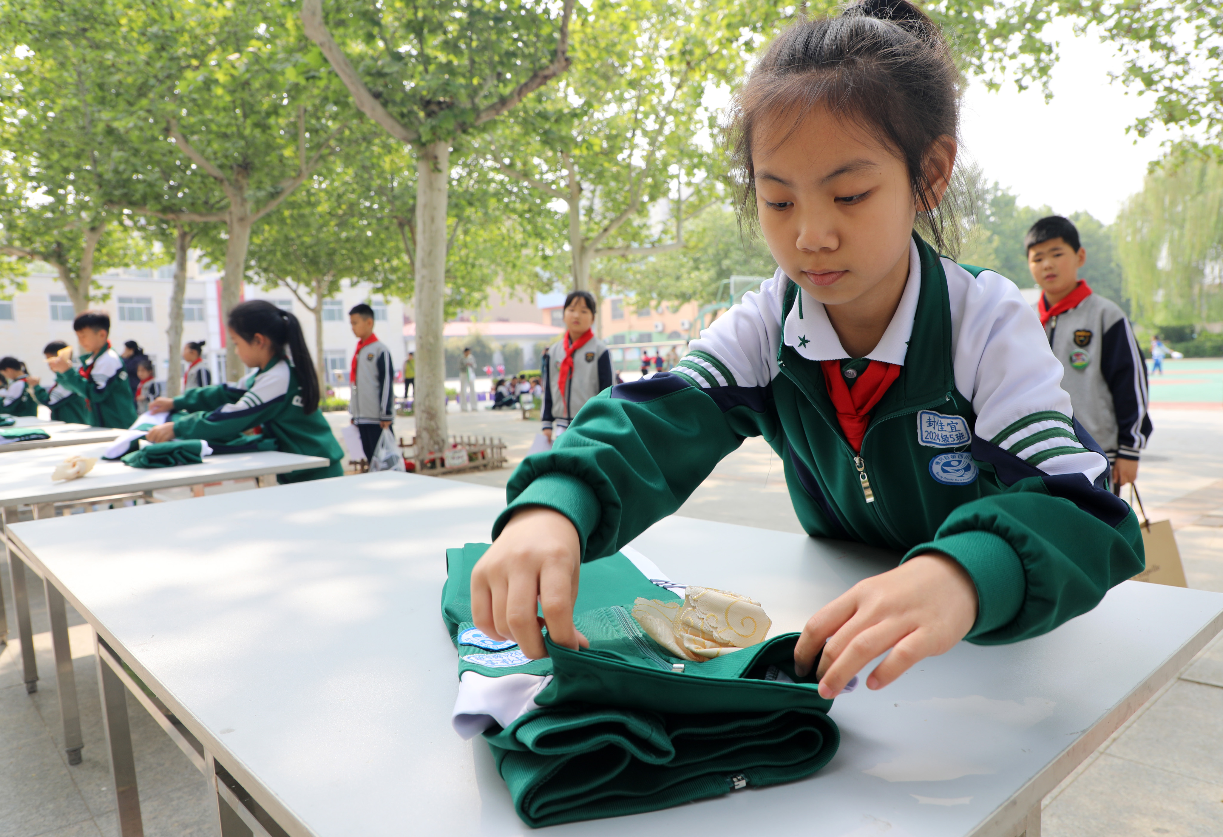 在山东省滨州市博兴县第四届小学生劳动技能大赛赛场,学生在参加“餐巾折叠和叠衣服”生活技能比赛。通讯员 陈彬 摄