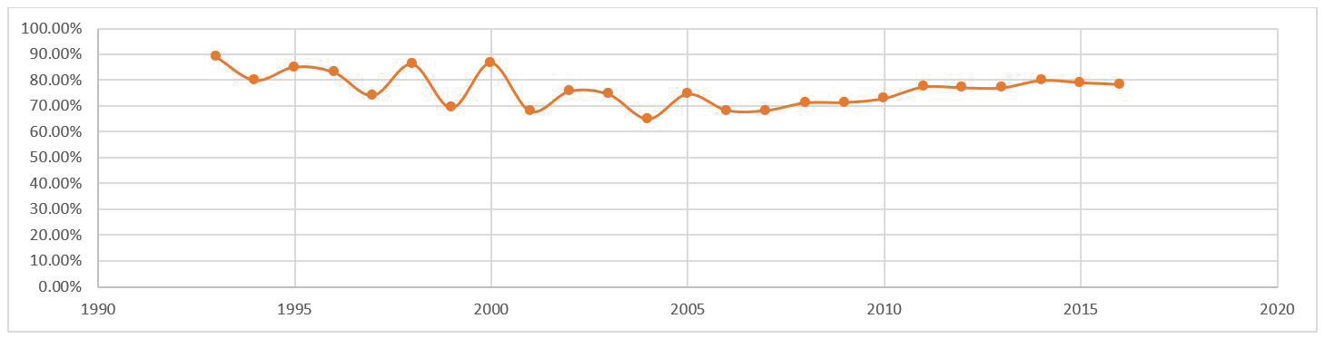 北京高校科技经费预算执行情况通过计算经费的支出与拨入的比值获得。从1993年至2016年,北京高校科技经费预算执行情况的趋势由两个阶段组成:第一阶段为波动期(1993年-2005年),高校科技经费的预算执行情况在60%至90%之间波动;第二阶段为稳定期(2006年-2016年),高校经费的预算执行情况总体稳中有进,从将近70%增至78%,接近波动期的预算执行平均值,与1993年的预算执行最好情况还有一定差距。