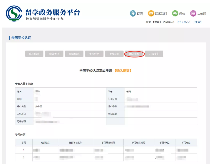 流程共分为“基本信息”“申请类型”“申请信息”“学习经历”“上传材料”“确认提交”“在线支付”7个环节。