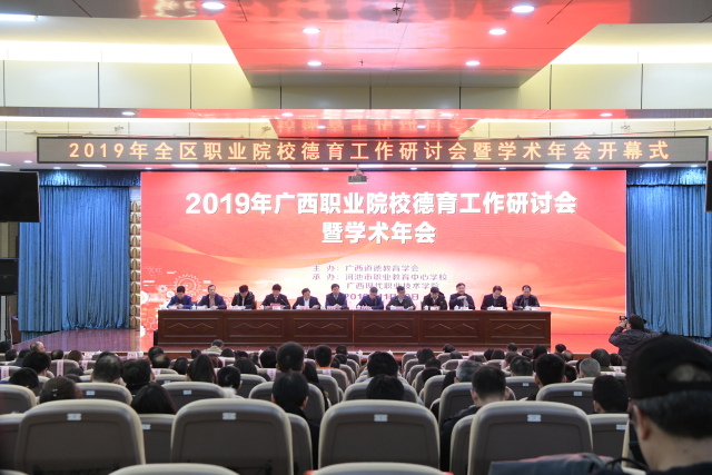 中国教育新闻网讯(实习生 陈玲)由广西道德教育学会主办、河池市职业教育中心学校和广西现代职业技术学院联合承办的2019年全区职业院校德育工作研讨会暨学术年会,11月29日-30日在广西河池市职业教育中心学校召开。来自广西壮族自治区65所职业院校的近300名专家、学者及各职业院校领导老师参会。广西自治区教育工委、广西教育厅、河池市政府、广西道德教育学会、河池市教育局等部门相关负责人出席会议。