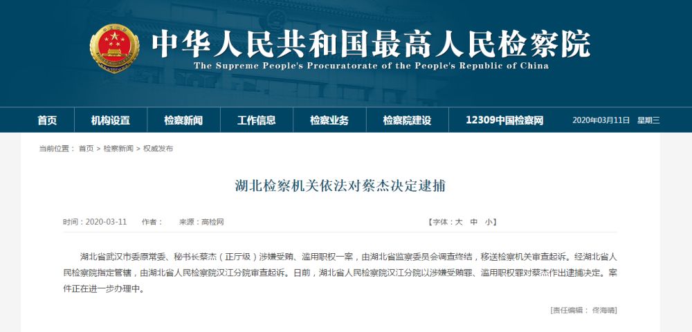 湖北省武汉市委原常委、秘书长蔡杰(正厅级)涉嫌受贿、滥用职权一案,由湖北省监察委员会调查终结,移送检察机关审查起诉。经湖北省人民检察院指定管辖,由湖北省人民检察院汉江分院审查起诉。日前,湖北省人民检察院汉江分院以涉嫌受贿罪、滥用职权罪对蔡杰作出逮捕决定。案件正在进一步办理中。