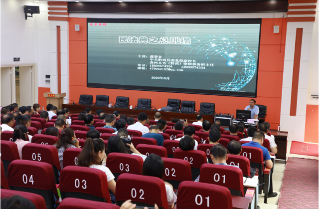 图二为黔西县委党校副校长、贵州(黔西)本方律师事务所主任吴学文在对学校师生作《中华人民共和国民法典》专题培训。