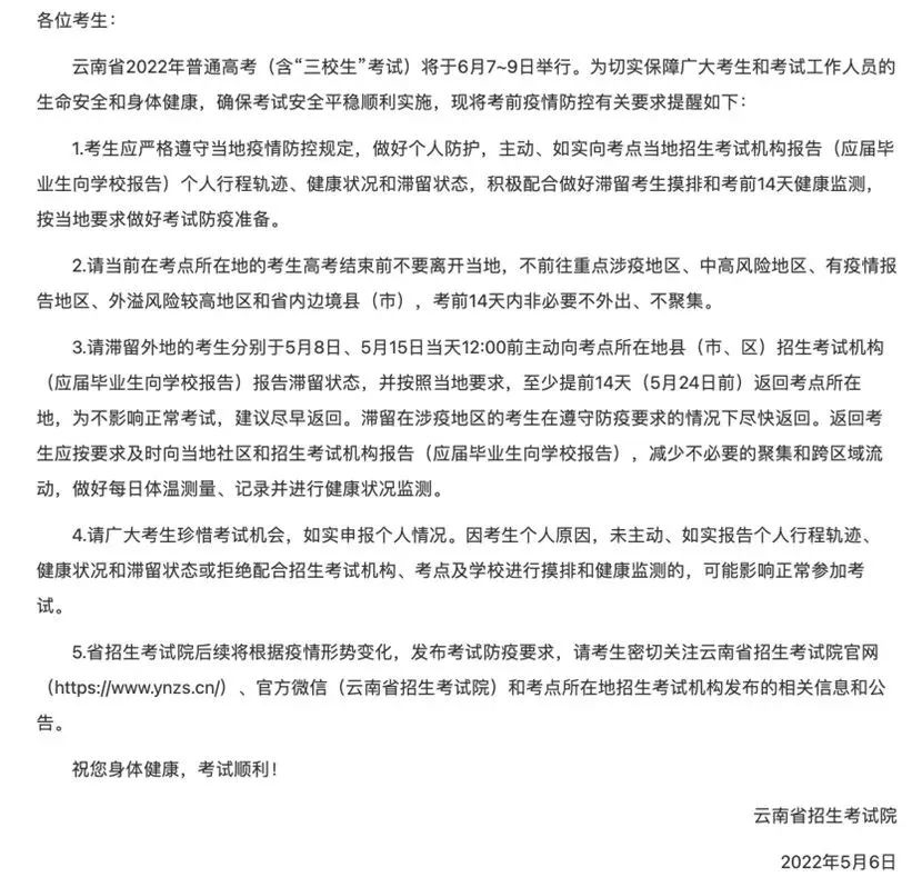 为切实保障广大考生和考试工作人员的生命安全和身体健康,确保2022年全国高考平稳、有序举行,按照教育部、国家卫生健康委关于高考防疫工作的有关要求,近期,各地已陆续向2022年高考考生发布参加高考的注意事项。在此,教育部再次提醒全体考生——