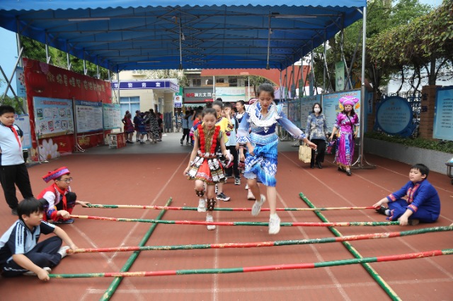 南宁市星湖小学五六年级的学生体验壮族活动“竹竿舞”。路蕊蔚 摄