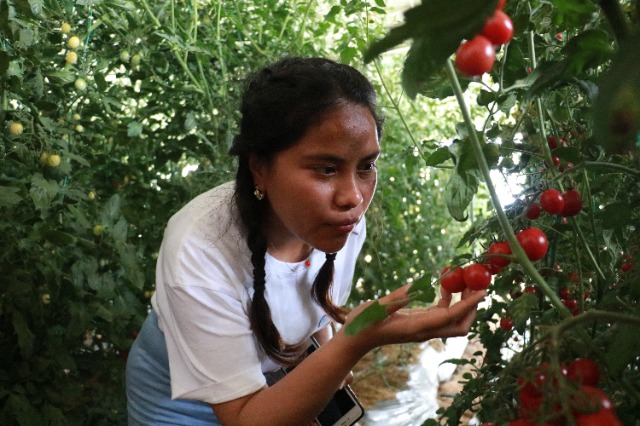 庆阳市西峰区高原夏菜集约化生产基地中,留学生采摘西红柿。马绮徽 摄
