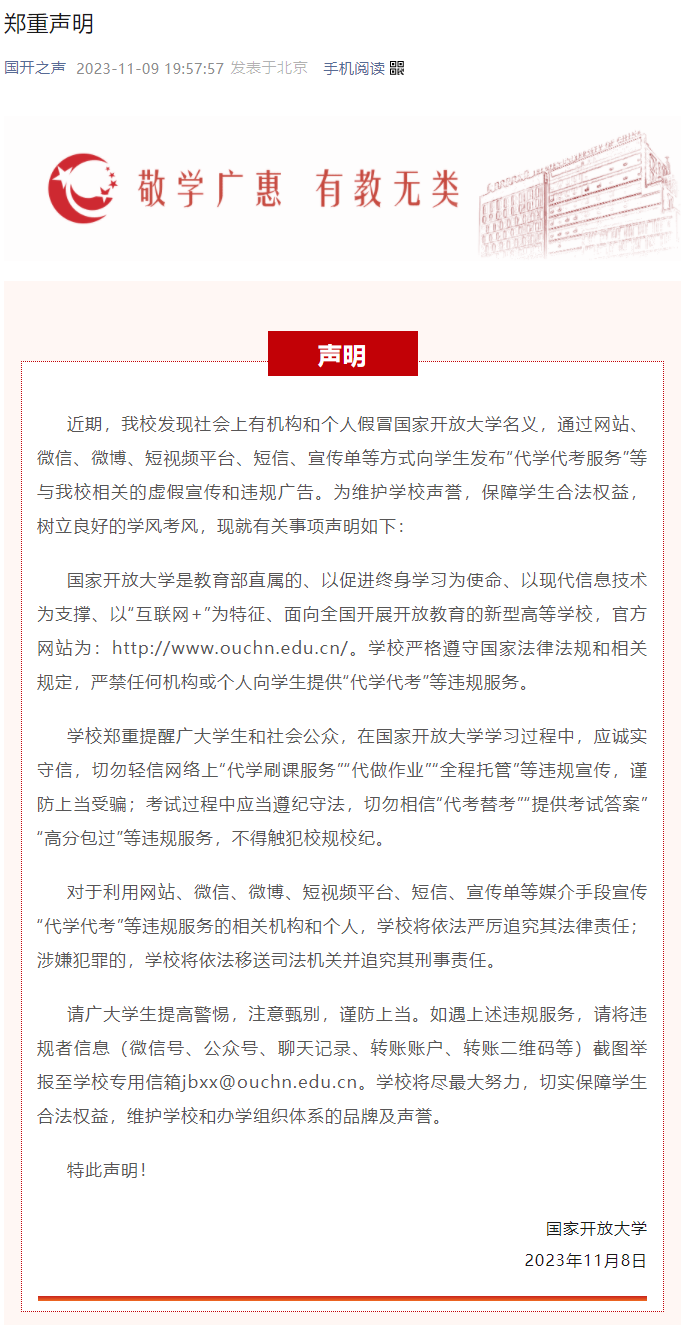 近期,我校发现社会上有机构和个人假冒国家开放大学名义,通过网站、微信、微博、短视频平台、短信、宣传单等方式向学生发布“代学代考服务”等与我校相关的虚假宣传和违规广告。为维护学校声誉,保障学生合法权益,树立良好的学风考风,现就有关事项声明如下: