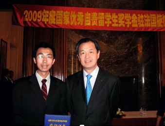 2010年6月4日下午,我与其他19名获奖的留法学子一同在巴黎的中国驻法国使馆参加“国家优秀自费留学生奖学金”颁奖仪式,并有幸受到时任驻法大使孔泉的接见。孔泉大使为在场的每一位获奖学子颁发证书,随后发表了热情洋溢的讲话。他表示,广大留学人员是祖国建设创新型国家、增强自主创新能力的一支主力军,是国家的宝贵财富。他勉励我们在科学前沿不断探索,取得新的成绩,并以多种方式报效祖国。孔大使的讲话让在场的每一位获奖者心潮澎湃,我也激动地在社交媒体上和朋友们分享了这一喜讯。