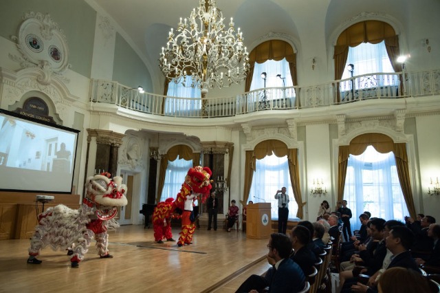 这是2022年6月21日在匈牙利布达佩斯举行的罗兰大学孔子学院成立15周年庆典上拍摄的舞狮表演。目前,匈牙利已开设5所孔子学院。