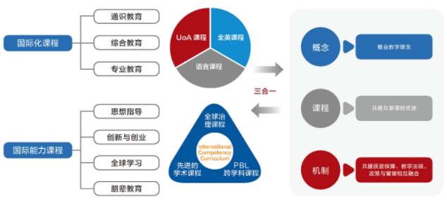 优课程,切实提高新工科人才培养过程质量。一流创新人才培养是高校的根本任务和使命。中外合作办学在人才培养上具有开拓国际视野和创新能力的优势。在人才培养方案中,通过课程体系的国际融合和科学设置,将为一流创新人才的培养开辟有效路径。学院让中英双方共同设计课程和培养方案,课程设计满足四个“三分之一”原则,每个专业超过50%的学科基础课和专业课由阿伯丁大学承担。在课程体系设置上,结合国内人才培养体系中需涵盖的通识课程、学科大学课程和专业课程,构建了一套融合概念、课程和机制的国际化课程体系(如图)。