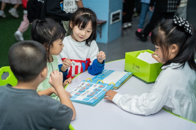 孩子们正在合作完成图文对应的主题游戏。学校供图