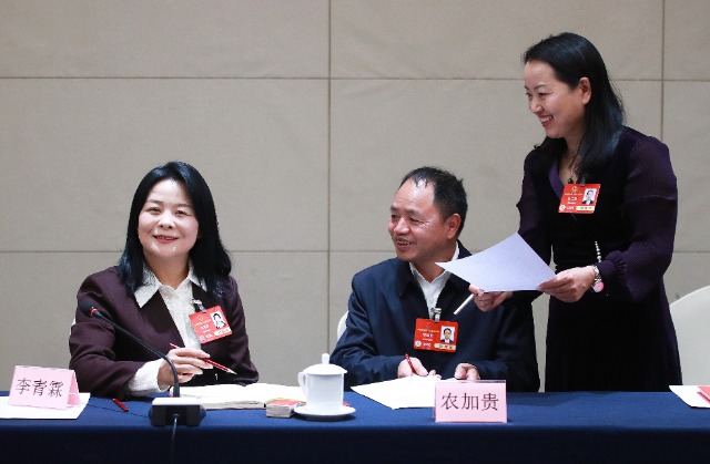 3月9日,李青霖(左)农加贵(中)、甄兰芳3位代表在一起讨论交流。