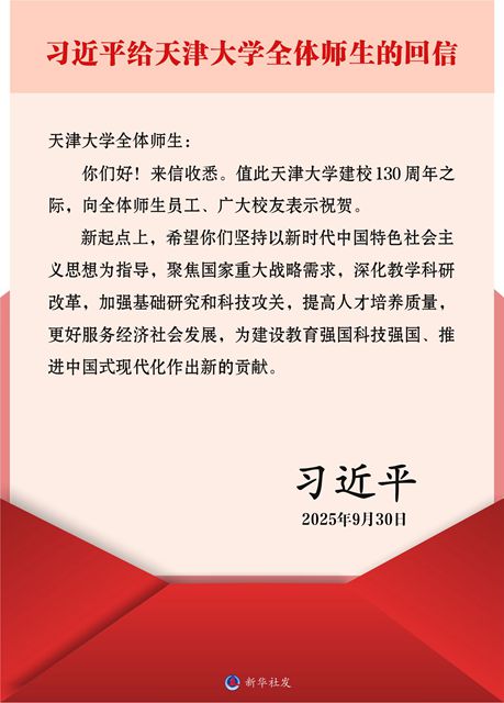 近日,中共中央总书记、国家主席、中央军委主席习近平给天津大学全体师生回信,在天津大学建校130周年之际,向全体师生员工、广大校友表示祝贺。