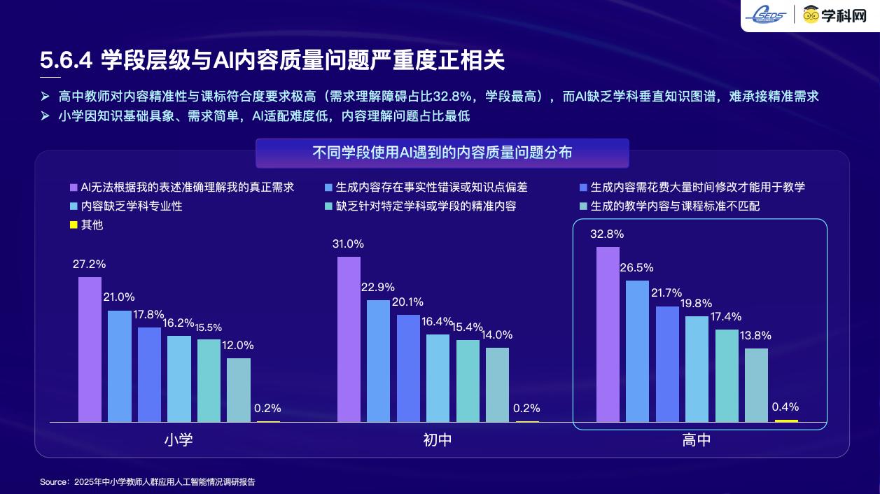 报告显示,教师对于人工智能的应用在学段上差异明显,小学教师应用场景以基础教学资源获取为主;初中教师的应用则逐渐向应试需求倾斜,出题组卷类工具的使用需求增加;高中教师对生成内容的精准度要求最为严格,对内容专业性与准确性的期待更高。