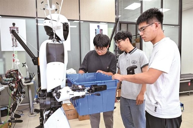 华中科技大学机械科学与工程学院内,研究人员对人形机器人进行搬运测试。新华社发