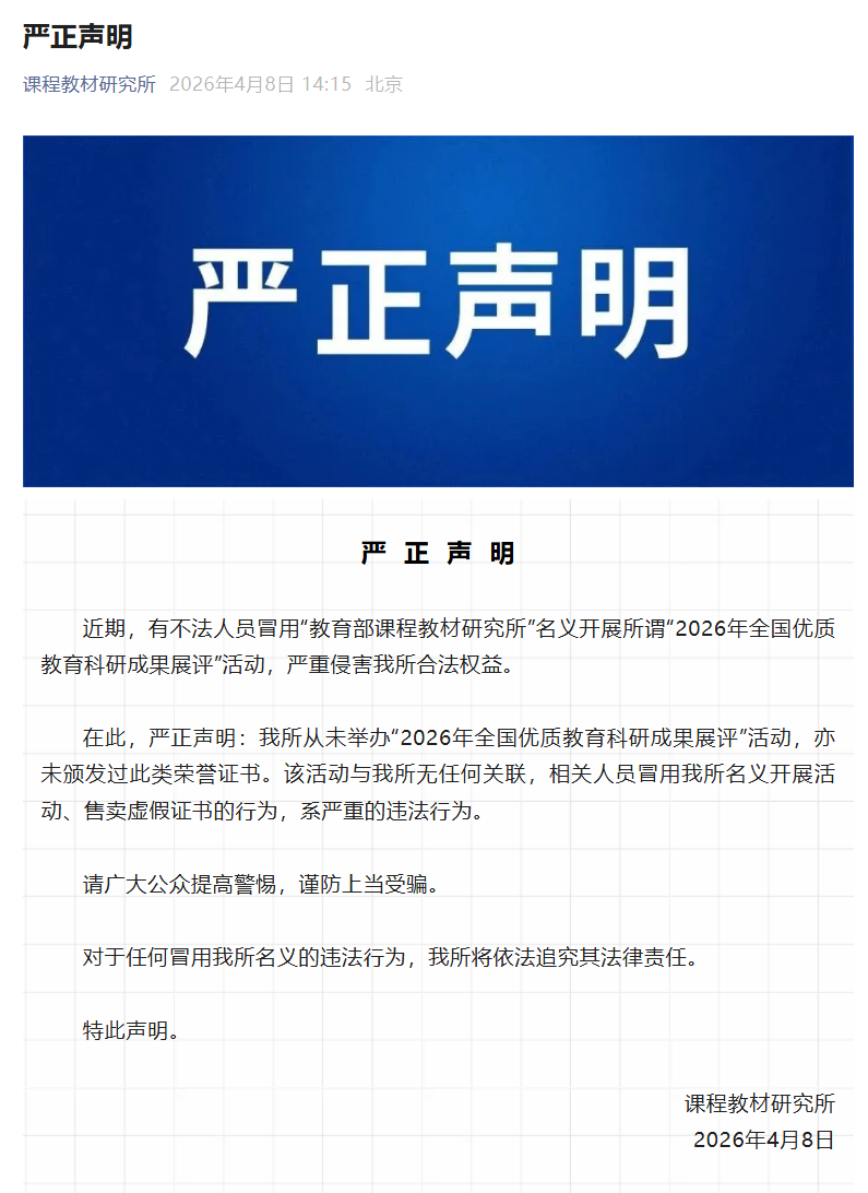 近日,课程教材研究所通过微信公众号发布严正声明,表示:近期,有不法人员冒用“教育部课程教材研究所”名义开展所谓“2026年全国优质教育科研成果展评”活动,严重侵害我所合法权益。我所从未举办“2026年全国优质教育科研成果展评”活动,亦未颁发过此类荣誉证书。该活动与我所无任何关联,相关人员冒用我所名义开展活动、售卖虚假证书的行为,系严重的违法行为。请广大公众提高警惕,谨防上当受骗。对于任何冒用我所名义的违法行为,我所将依法追究其法律责任。特此声明。