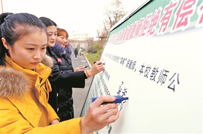 11月27日,江苏东海县实验小学教师在拒绝有偿补课承诺书展板上签名。当日,该县各中小学和幼儿园举行教师拒绝有偿补课公开承诺签名活动,全县1.3万余名在职教师参与。张开虎 许增文 摄