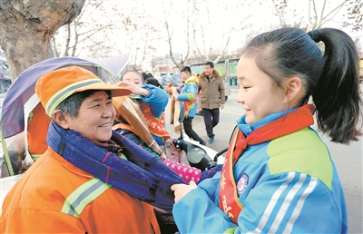 12月24日,江苏省东海县实验小学学生为环卫工人系上保暖的围巾。当日,江苏省东海县实验小学学生拿出在班级开展的“收旧利废 保护环境”活动中积攒的钱,购买了保暖围巾和棉手套,走上街头,赠送给在寒风中劳动的环卫工人,表达他们对“城市美容师”的关爱。张开虎 陈桓 摄