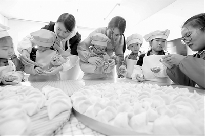 近日,小朋友在教师指导下学习包饺子。江苏省连云港市东海县第三幼儿园组织小朋友开展“包饺子 学技能”活动,小朋友们在教师指导下学习包饺子、切面条、搓馒头等,在实践中获得劳动技能、技巧,提高生活自理能力。