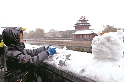 11月30日,一名孩子在雪后的故宫角楼附近堆雪人。11月29日起,北京市出现大范围降雪,积雪覆盖了北京城区,为人们带来了惊喜。