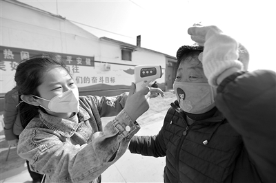 2月13日,山东聊城大学学生刘晓晨(左)在给村民测量体温。近日,刘晓晨和山东体育学院的刘晓君、菏泽学院的刘晓静自发组成大学生志愿服务队,为聊城茌平区贾寨镇邢胡刘村村民和行人进行体温测量、信息登记,确保疫情防控措施落到实处。赵玉国 刘浩 摄