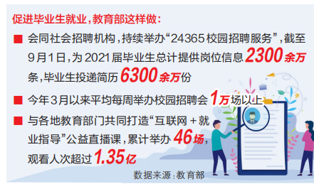 从数据可以看出这一举措释放了多大能量。教育部会同社会招聘机构,持续举办“24365校园招聘服务”,截至9月1日,为2021届毕业生总计提供岗位信息2300余万条,毕业生投递简历6300余万份;指导各地各高校持续举办校园招聘活动,今年3月以来平均每周举办校园招聘会1万场以上;会同20多个部委,举办专场招聘会54场,提供岗位信息近500万个……