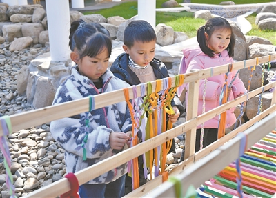 2019年起,该园鼓励每班每学期自主生成一个班本课程,大(2)班的孩子们就产生了“造一座桥给幼儿园留念”的想法。历时一个月,桥终于造成了。图/李佳佳 文/龚琴娟