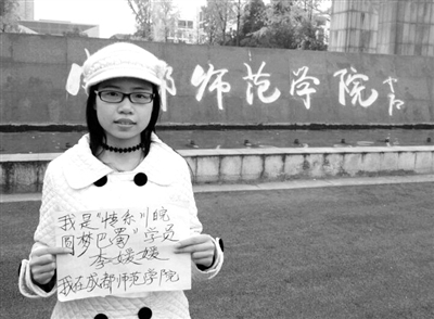 一张名为“归雁”的照片上,一名微笑的女孩手举一张白纸,上面写着:“我是‘情系川皖·圆梦巴蜀’学员李媛媛,我在成都师范学院。”