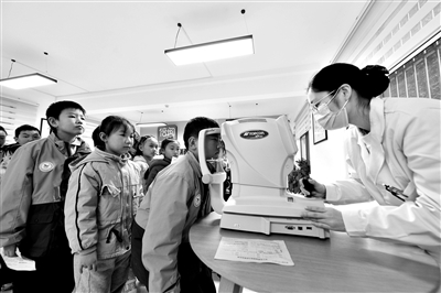 近日,在湖北省襄阳市保康县城关镇土门小学,眼科医生为学生做视力筛查。该校邀请眼科医生入校,帮助学生及时发现视力问题并采取预防和治疗措施,提高学生爱眼意识。杨韬 刘国清 摄