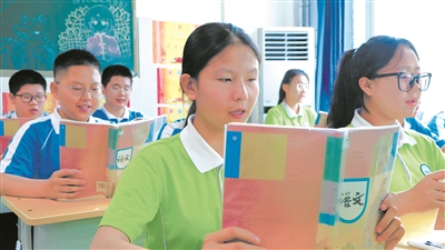 “泰山古称岱山,有‘天下第一山’的美称,泰的意思是安定、美好、极、通畅。在中国人心中,泰山就是一座大美之山。”在泰山学院附属中学初二(10)班教室里,语文教师时晓筠正带领学生学习统编语文教材七年级下册里的《望岳》。窗外,抬头便可见泰山的轮廓。