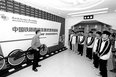陕西铁路工程职业技术学院党委书记焦胜军(左一)为学生讲述中国铁路建设发展历程。资料图片