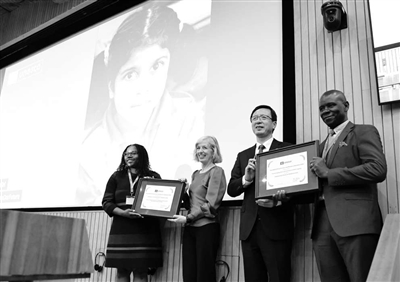 10月16日,在位于法国巴黎的联合国教科文组织总部,乌干达机构“促进非洲学校平等网络”的负责人(右一)和赞比亚机构“促进女性教育行动”的代表(左一)出席颁奖仪式。