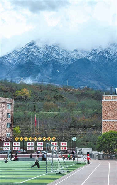 2024年12月底,宜东镇中心小学的同学们在雪山下的校园踢球。 本报记者 葛仁鑫 摄