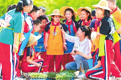 ①呼和浩特市玉泉区百什户小学教师在“校园农场”向学生传授秧苗栽种经验。 丁根厚 摄