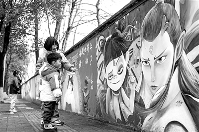 2月23日,小朋友在湖南省长沙市岳麓区岳麓街道五星村观看哪吒主题墙绘。