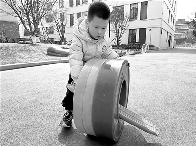 糖豆尝试用一块平衡板推动大圆轮。周亚芳 摄