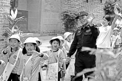 入园时,保安与民警、志愿者一同迎接幼儿。遇到情绪低落的幼儿,他们会主动迎上、抱进园内。离园时,保安与幼儿互道再见,完成温馨的离园仪式。他们更是有心的观察者:一次,有家长随手丢果皮,一名幼儿主动捡起扔进垃圾桶。保安立刻表扬幼儿,并倡议家长“向幼儿学习”。