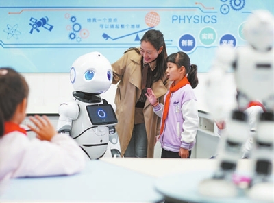 江苏省泰州市姜堰区淮海小学学生与智能机器人互动。周社根 摄