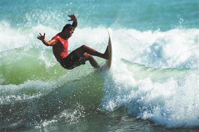 在冲浪男子短板决赛中,18岁的海南队选手吴世栋战胜对手夺冠。