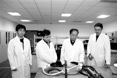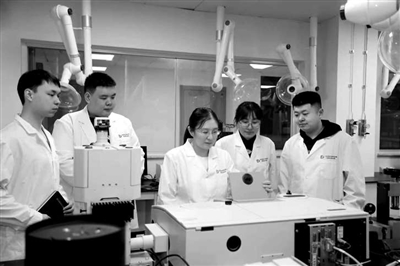 绿色造纸与资源循环全国重点实验室主任吉兴香教授(左二)指导学生实验。