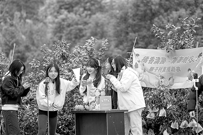 在四川眉山天府新区青龙街道狮子村,四川大学锦江学院的学生正在通过直播推销柑橘。翁光建 摄