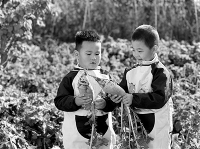 甘肃省张掖市临泽县西关幼儿园的孩子们在拔萝卜。 资料图片