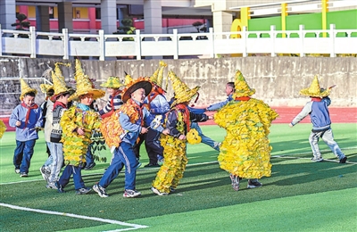 11月21日,湖北省十堰市竹山县恒升小学大课间,学生身着用银杏叶、枫叶、金菊等材料制作的服饰在操场上做游戏。