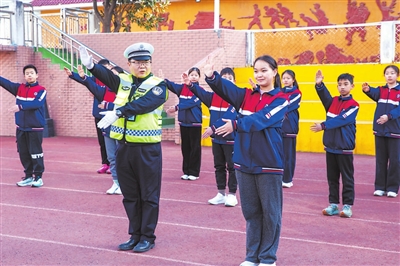 11月28日,湖北省襄阳市诸葛亮中学,民警正在教学生们交通安全手势。 李旭晖 摄