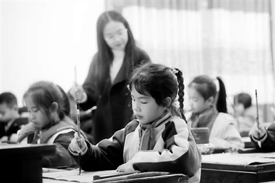 在湖南省怀化市通道侗族自治县礼雅小学,毛笔兴趣班的孩子们在练习毛笔字。李尚引 摄